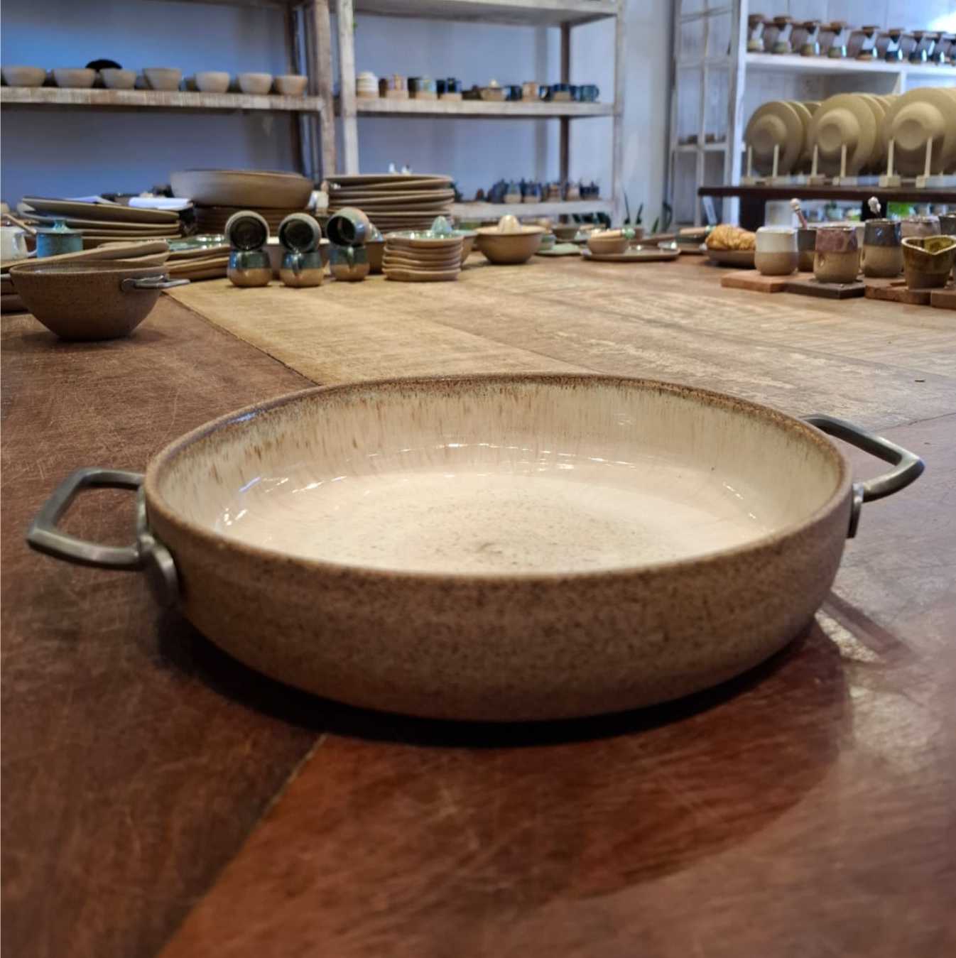 Travessa artesanal em cerâmica de alta temperatura, conferindo resistência e impermeabilização. Com alça em estanho. 100% materiais atóxicos.