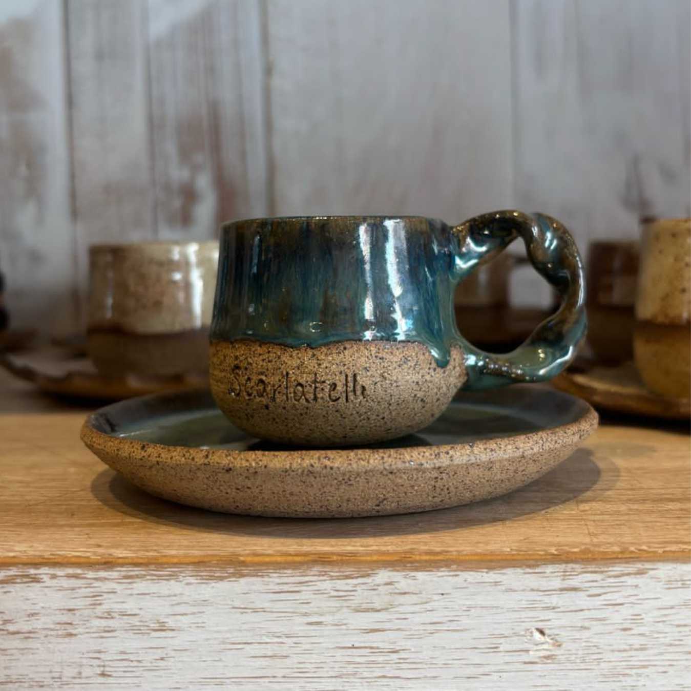 Xícara de Café Alça Torcida artesanal em cerâmica de alta temperatura, conferindo resistência e impermeabilização. 100% materiais atóxicos.